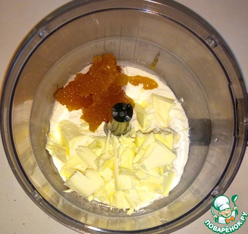 Для штрейзеля в блендере или комбайне пробить муку, мёд и сливочное масло (можно растереть руками)...