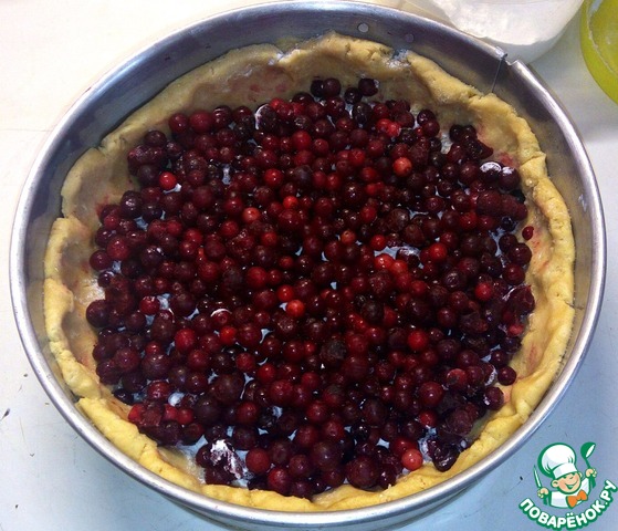 Выложить бруснику, не размораживая. Присыпать сахаром по вкусу. Я взяла 4 чайных ложки сахара, начинка в готовом пироге получилась чуть кисловатой, но нам такое нравится.