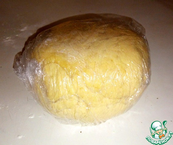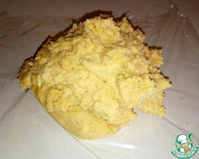 Тесто выложить на пищевую плёнку. Оно мягкое и липкое - так и должно быть, если тесто не растекается, муку добавлять не нужно.
