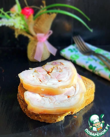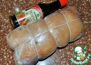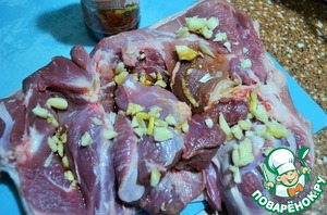 Рульку сбрызнуть соевым соусом, разложить по всему разрезу рубленый чеснок.