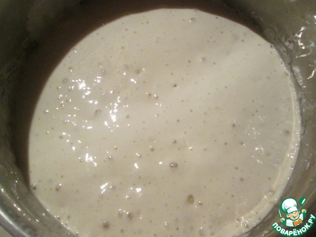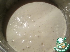 Сначала приготовим опару. Для этого нужно растворить в 300 мл. теплой воды дрожжи и добавить 250 г. просеянной муки, вымешать, чтобы не было комочков. Опара будет по консистенции, как тесто для оладьев. Оставить для подъема на 30-60.