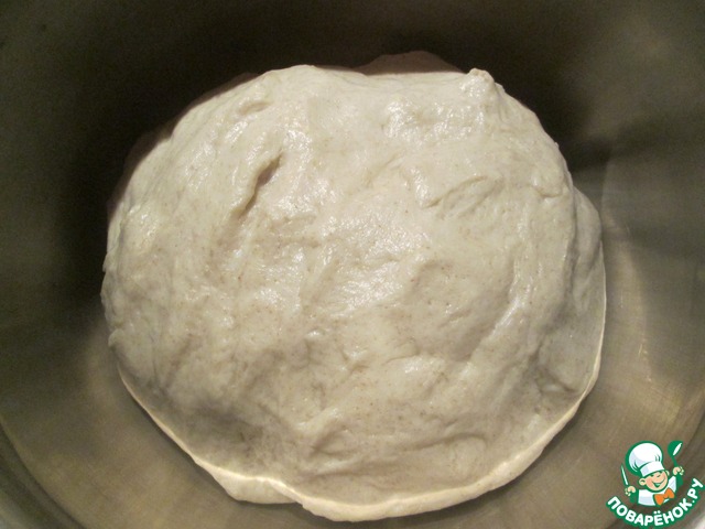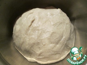 В подошедшую опару добавить соль, размешать, затем добавить растительное масло. Всыпать еще 250-300 г. просеянной муки и замесить гладкое, не липнущее к рукам тесто. Оставить тесто для подъема в теплом месте примерно на 1 ч.