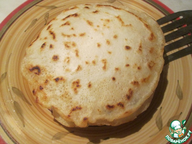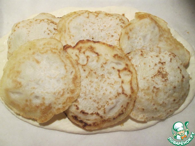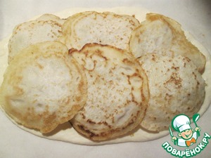 Накрываем внахлест блинами, у меня ушло шесть штук.