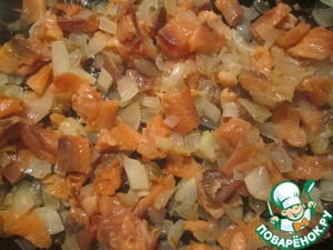 Выкладываем половину копченой рыбы с луком, затем половину белой рыбы.