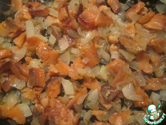Для начинки нарезать белую рыбу небольшими ломтиками, посолить и поперчить. Копченую рыбу нарезать помельче. Порезать лук, обжарить на разогретом масле, помешивая, минут 10. Снять с огня, немного остудить. Смешать с копченой рыбой, поперчить.