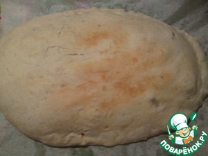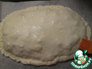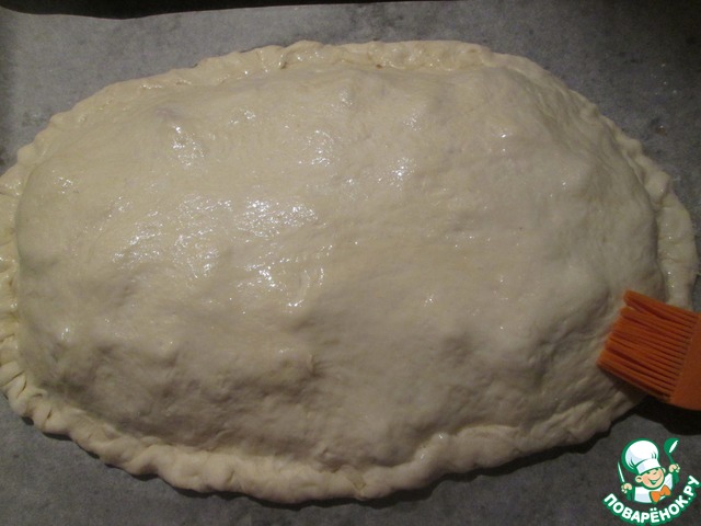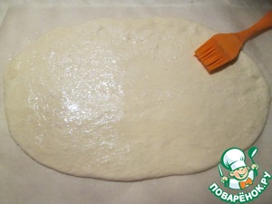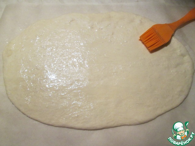 Можно собирать пирог. В оригинале рецепта было указано, что печь нужно в форме, но так кулебяка получается очень высокая, долго и плохо пропекается, поэтому я в этот раз готовила на противне. Тесто разделить на две неравные части. Раскатать большую часть, придавая ей овальную форму, и немного смазать растительным маслом. Раскатывала я прямо на пергаменте и на нем же переносила заготовку на противень.