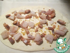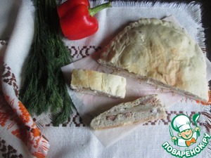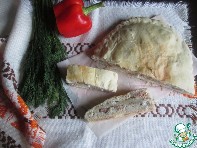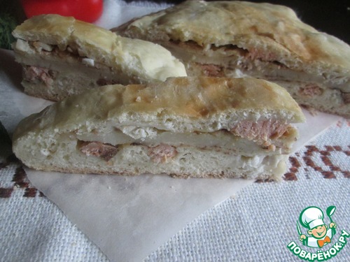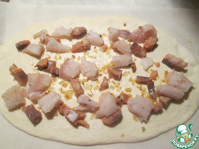 Следующий слой - оставшаяся копченая рыба с луком и белая. Теперь раскатываем меньшую часть теста, накрываем кулебяку, защипываем края и немного смазываем растительным маслом