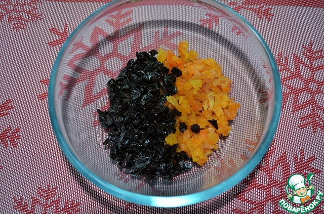 Курагу и чернослив нарезать мелко.