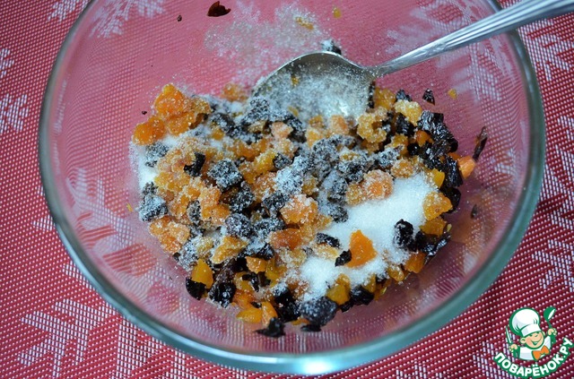 В набухшие сухофрукты добавить сахар, перемешать.
