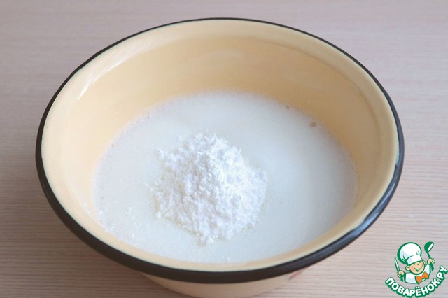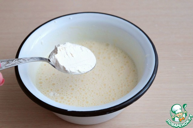 Добавить в смесь желтков и соды 3 ст. ложки (с небольшой горкой) муки. Взбить до однородного состояния.