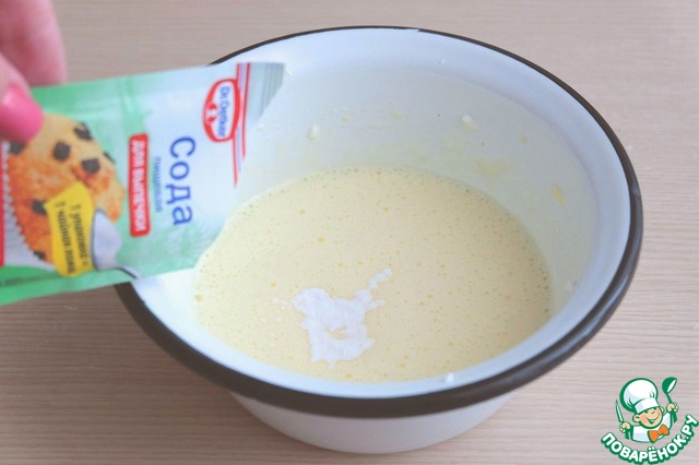 Взбить желтки, добавить 1 пакет соды для выпечки ТМ "Dr. Oetker".