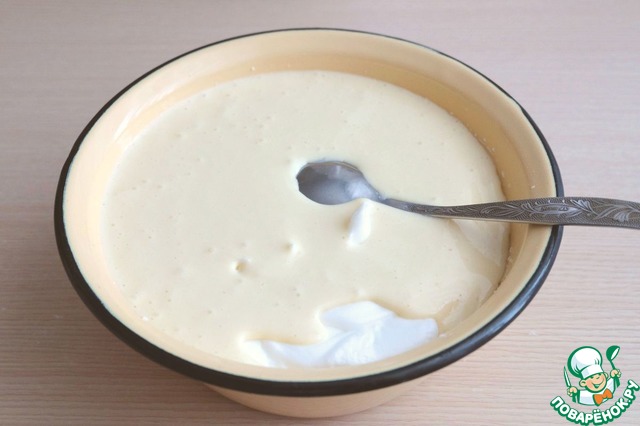 Добавить к взбитым белкам желтково-сливочную смесь. Жидкое тесто вымешать осторожно ложкой снизу вверх.