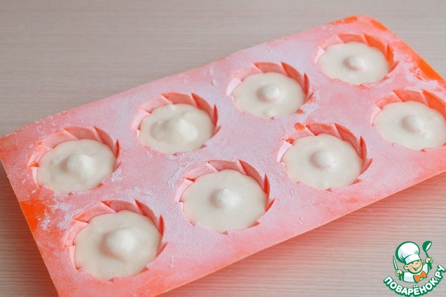 Силиконовую форму для выпечки смазать сливочным маслом, присыпать мукой. Сделать французскую рубашку. Заполнить формы жидким тестом, не доходя до края 4-5 мм. (пирожные при выпекании поднимутся). Форму отправить в разогретый до t180-190С духовой шкаф, выпекать до золотистого состояния.