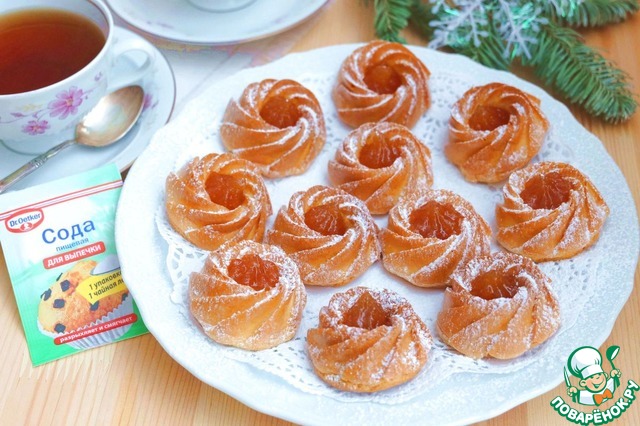 Готовые остывшие пирожные наполнить абрикосовым джемом при помощи кулинарного корнетика, посыпать сахарной пудрой.