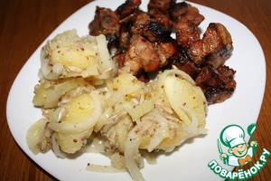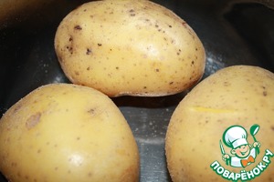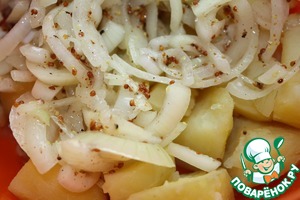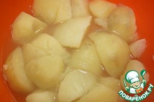 Нарезать на крупные куски и, пока картофель горячий, залить его бульоном.