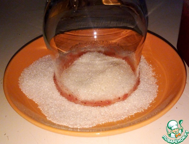 • Кромку бокала обмакиваем сначала в пюре, затем обкатываем в сахаре. Оставляем высохнуть, желательно в таком же вверх-дном-перевернутом виде.