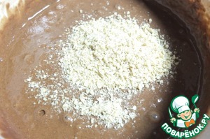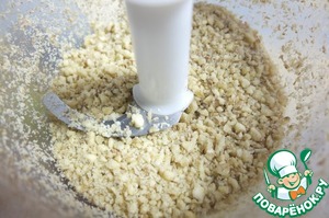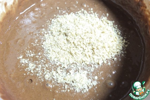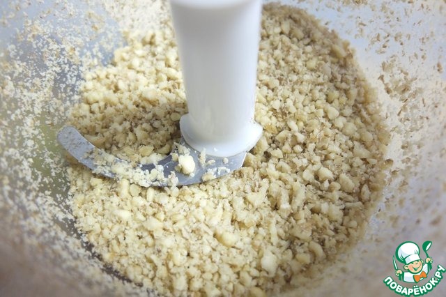 В сухую смесь добавляем взбитую, тщательно перемешиваем. Добавляем измельченные орехи.