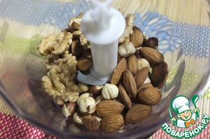 - Орехи (у меня фундук, миндаль, грецкий орех) — 100 г