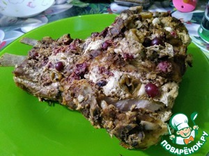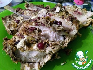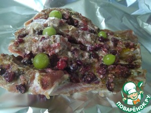 Мясо порезать гармошкой, посолить. Клюкву размять вилкой и смешать с маслом и специями. Смазать мясо, крыжовник вставить в разрезы, завернуть в фольгу и оставить мариноваться на ночь в холодильнике.