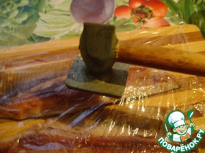 Филе сельди накрыть пищевой плёнкой и аккуратно отбить.