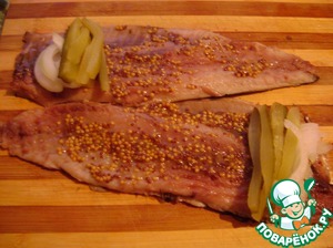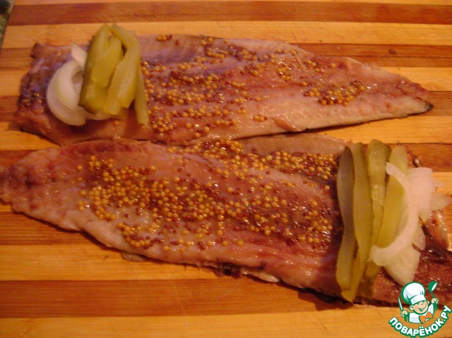 Каждое филе смазать горчицей. С широкой стороны выкласть ломтики огурца ( или по корнишончику) и полукольца лука.