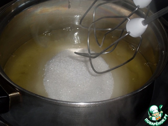 Отделяем белки от желтков. Белки выливаем в чистую и сухую посуду. (Кастрюлю и венчики миксера я протерла ватным диском, смоченным 9%-ым уксусом).