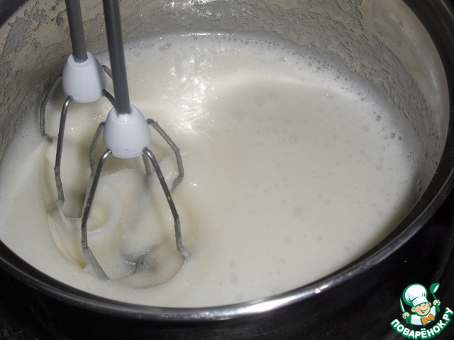 Затем скорость миксера увеличиваем. Масса белеет и увеличивается в объёме.