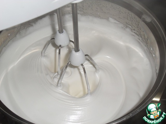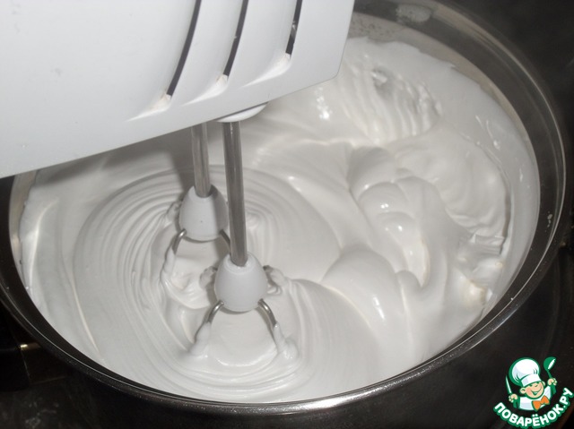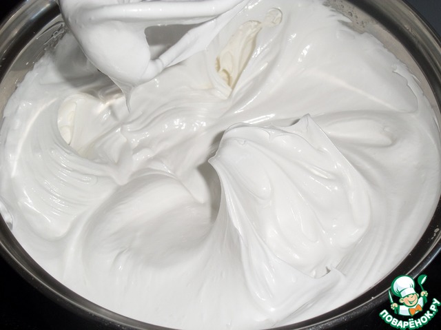 Затем кастрюлю с белковой массой убираем с водяной бани и взбиваем ещё 3-4 минуты. Масса становится более плотной и собирается вокруг венчиков миксера.
