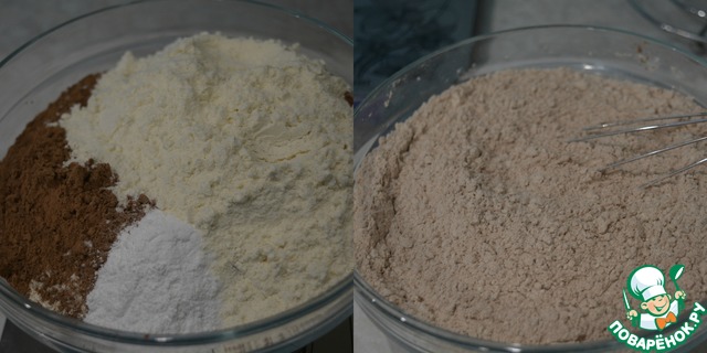 Смешать в миске муку, какао, разрыхлитель и соду. Отставить в сторону.