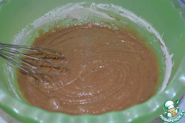 В смесь с яйцом добавить половину мучной смеси. Перемешать.