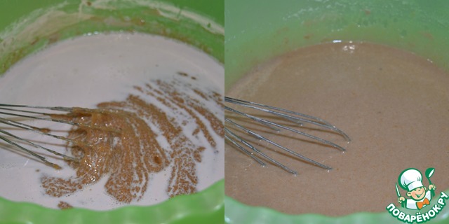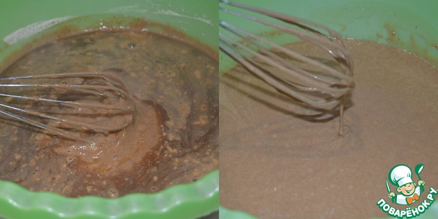 Добавить молоко и ликер, все перемешать. Всыпасть оставшуюся мучную смесь и смешать.
