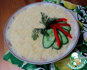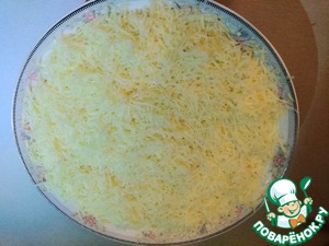 5 слой. Тертый на мелкой терке сыр. Щедро посыпаем сверху. Потом блюдо закрываем пищевой пленкой и минимум пару часов держим в холодильнике или на балконе в холоде. Я делаю салат днем, чтоб поставить на новогодний стол, или с вечера, если намечается "утренник".