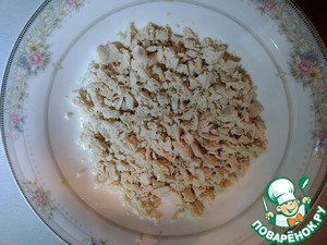 Собираем слои. Отварную курицу мелко режем. Смешиваем с двумя ложками заправки. Это будет 1-й слой. Куриная грудка суховата, поэтому я люблю смешать с заправкой, а не полить заправку сверху. Так лучше пропитается.
