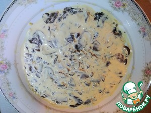 2 слой обжаренные шампиньоны. Опять ложка заправки, но сверху. Разравниваем заправочку по всему слою равномерно.