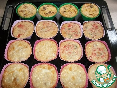 Далее можно разделить тесто на несколько частей (если начинка разная) и смешать с начинкой. Мне же удобнее сначала разложить немного начинки в формочки (использовать только силиконовые формы для маффинов, из других их сложно извлечь), а затем залить тестом. Начинка, как я уже говорила, может быть самая разная, отлично подойдут и грибы, мангольд и т. п. Фантазируйте! Только осторожно с солью.