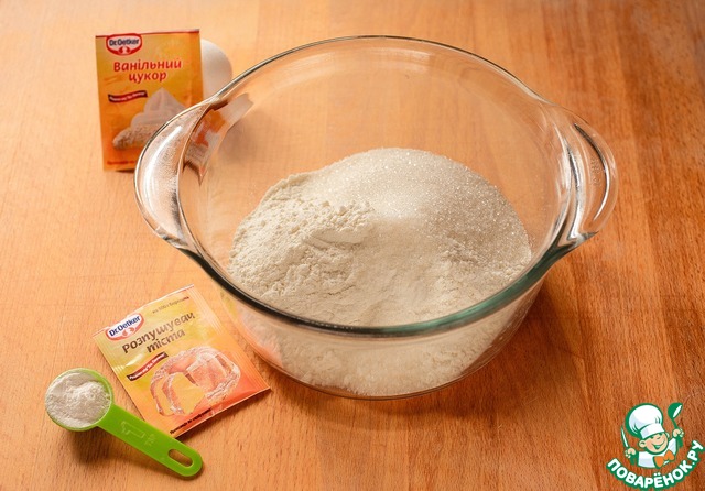 Итак, муку перемешиваем с разрыхлителем, обычным и ванильным сахаром, чтобы они равномерно распределились в тесте. -