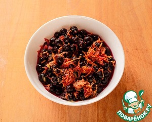 Окончательно соединять все ингредиенты начинки лучше когда тесто пора доставать из холодильника - к этому времени все как раз отлично охладится и пропитается.