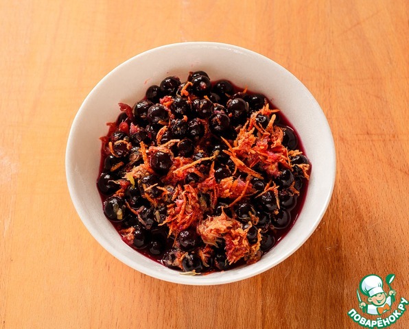 Смородину немного размораживаем (можно не до конца) и добавляем к ней 2-3 ст. л. сахара из общей массы сахара для начинки, сок и цедру апельсина.