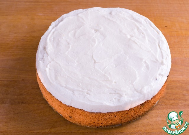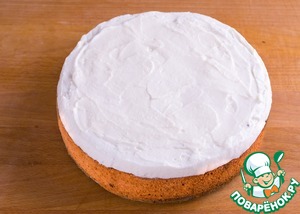 Наносим наш крем на пирог по возможности ровным слоем. Здесь может помочь кондитерский мешок с круглой насадкой или пакет с отрезанным уголком: нанести крем спиралью и хаотично разгладить ложкой.