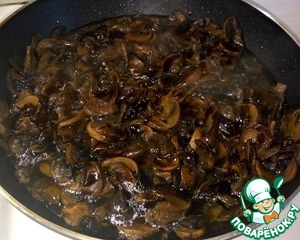 Грибы нарезать пластинками, выпарить жидкость и обжарить с добавлением 2 столовых ложек растительного масла. Посолить, поперчить.