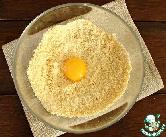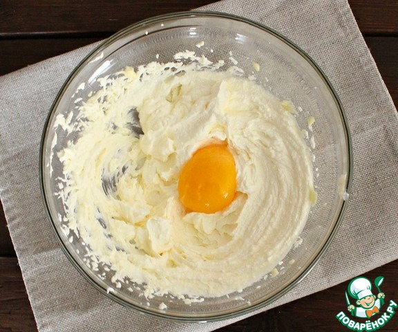 Теперь в массу добавляем желток (белок пригодится позже) и быстро замешиваем тесто. Тесто получается эластичным и однородным.