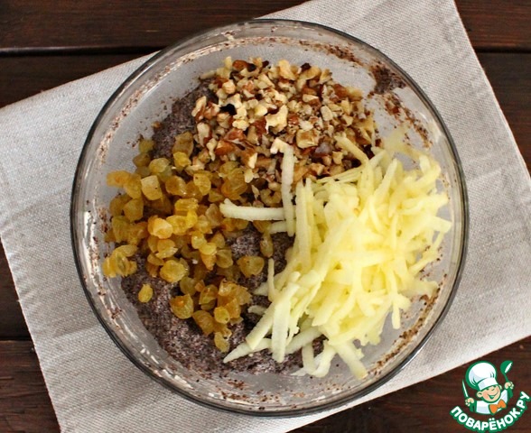Во взбитую массу в 2-3 приема добавляем маковую смесь. Перемешиваем ложкой. Затем добавляем изюм, орехи и яблоко, натертое на крупной терке. Снова перемешиваем.