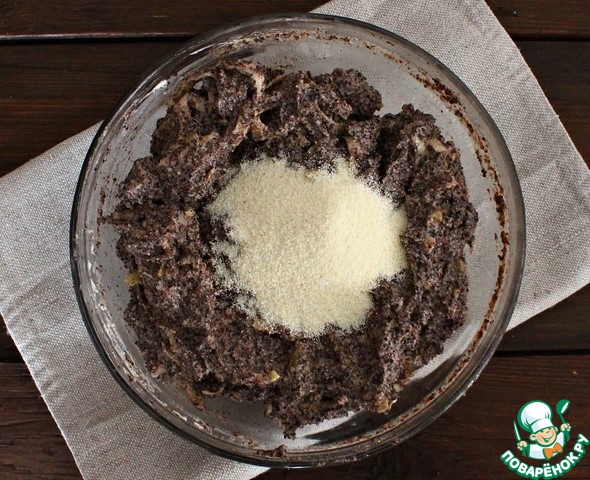 Теперь всыпаем манку, перемешиваем. Отставляем на время в сторону.