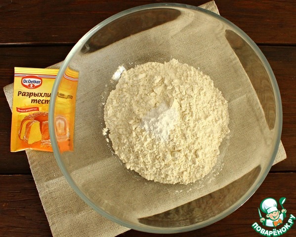 Муку вместе с разрыхлителем просеиваем в миску.