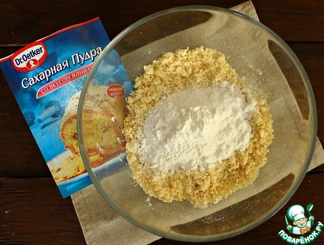 Добавляем кубики холодного сливочного масла и как можно быстрее перетираем в крошку руками. Затем всыпаем сахарную пудру, перемешиваем.