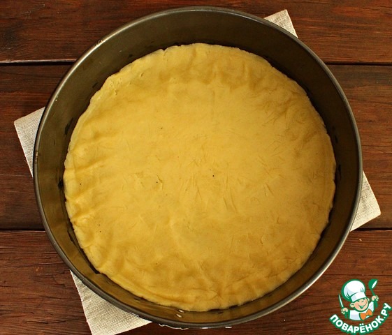 Дно формы диаметром 22 см застилаем пекарской бумагой. Выкладываем тесто и распределяем его равномерно по форме. Бортики делать не нужно. Форму с тестом убираем в холодильник на час.