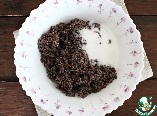 Мак перекручиваем 2 раза в мясорубке с самой мелкой решеткой. В перекрученный мак добавляем половину сахара (50 г) и перемешиваем. Или, как вариант, мак можно прокрутить через мясорубку вместе с сахаром.