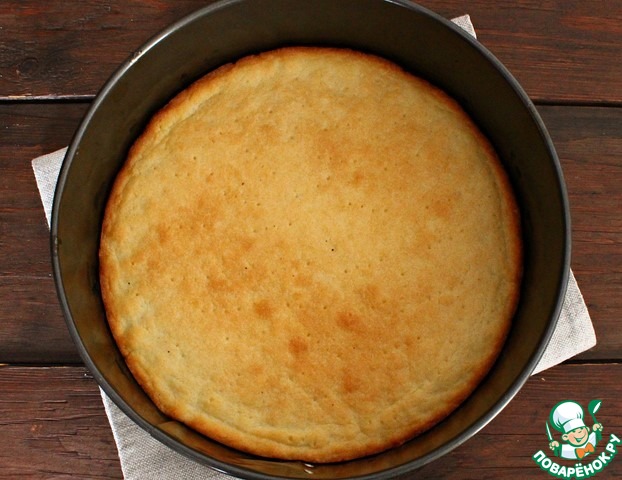 Достаем форму с тестом из холодильника, накалываем вилкой. Выпекаем в разогретой до 180-190 С духовке 10-12 минут. Корж должен немного подрумяниться. Я свой немного передержала и он получился сильно румяный. Вынимаем форму с коржом из духовки.