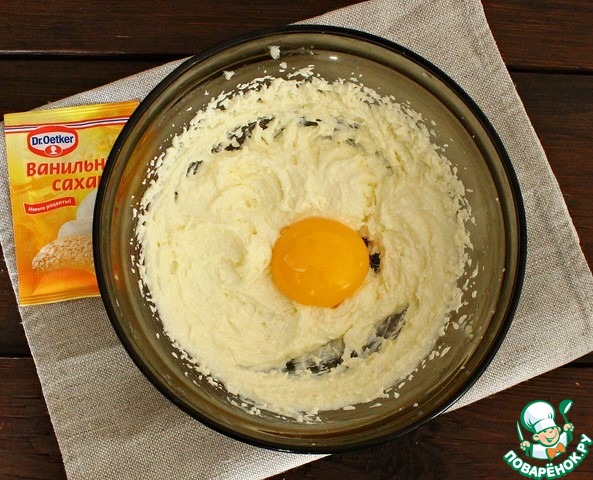Готовим творожную начинку. Мягкое сливочное масло соединяем с сахаром и ванильным сахаром. Миксером взбиваем до пышности 2-4 минуты. Добавляем поочередно 2 желтка, взбивая после каждого.