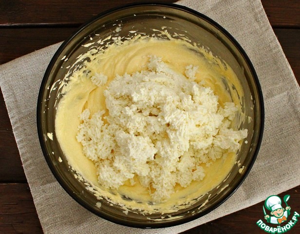 В полученную массу в 2-3 приема добавляем творог, перемешиваем ложкой. Творог заранее протираем через сито или пробиваем блендером. Всыпаем муку и еще раз перемешаем.